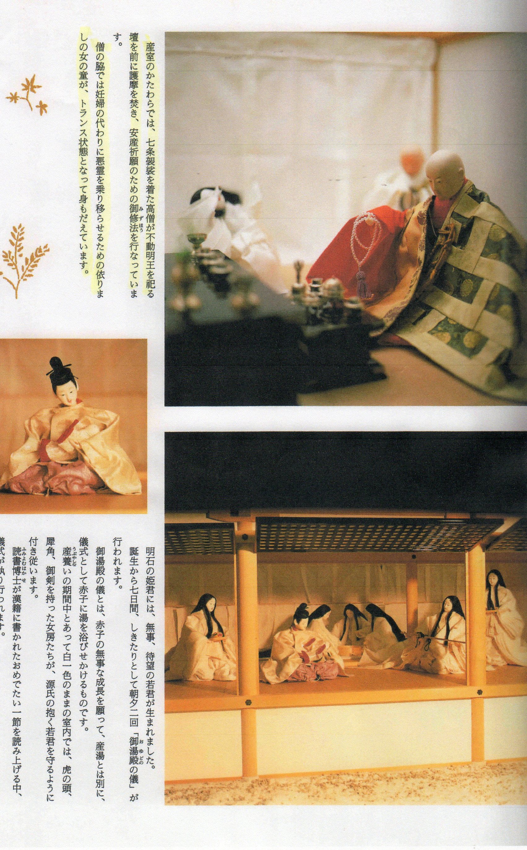 天児人形を貸して下さった方からお借りした本【宮廷装束に見る「源氏物語」の四季(有職文化研究所)発行】の中に、「出産」という項目が有りました。